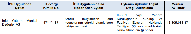 İnfo Yatırım Menkul Değerler AŞ hakkında yapılan inceleme sonucunda Kredili müşterilerin cari hesaplarının sürekli olarak borç bakiye vermesi nedeniyle 13.305.083,37 TL idari para cezasının uygulanmasına karar verilmiştir