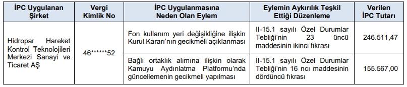 1-A ) Hidropar Hareket Kontrol Teknolojileri Merkezi Sanayi ve Ticaret AŞ hakkında yapılan inceleme sonucunda Fon kullanım yeri değişikliğine ilişkin Kurul Kararı’nın gecikmeli açıklanması ve Bağlı ortaklık alımına ilişkin olarak