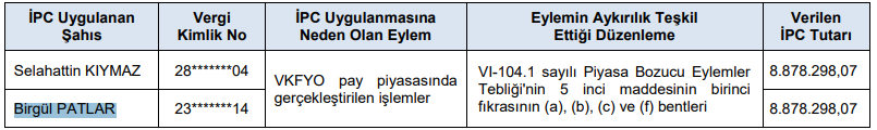 1-C) Vakıf Menkul Kıymet Yatırım Ortaklığı AŞ (VKFYO) pay piyasasında gerçekleştirilen işlemler ile ilgili olarak yapılan inceleme sonucunda, VKFYO pay piyasasında gerçekleştirilen işlemler nedeniyle aşağıdaki tabloda yer alan idari para cezalarının uygulanmasına karar verilmiştir.