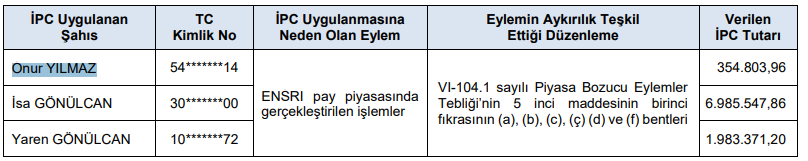 sonucunda, ENSRI pay piyasasında gerçekleştirilen işlemler nedeniyle aşağıdaki tabloda yer alan idari para cezalarının uygulanmasına karar verilmiştir.