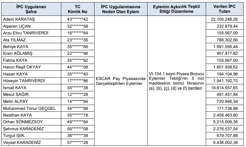 1- E) Escar Filo Kiralama Hizmetleri AŞ (ESCAR) pay piyasasında gerçekleştirilen işlemler ile ilgili olarak yapılan inceleme sonucunda, ESCAR Pay Piyasasında Gerçekleştirilen Eylemler nedeniyle aşağıdaki tabloda yer alan idari para cezalarının uygulanmasına karar verilmiştir.