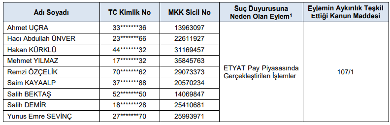 2- A) Euro Trend Yatırım Ortaklığı AŞ (ETYAT) pay piyasasında gerçekleştirilen işlemler ile ilgili olarak yapılan inceleme sonucunda, 6362 sayılı Sermaye Piyasası Kanunu’nun 107/1 maddesinde tanımlanan işlem bazlı piyasa dolandırıcılığı fiilinde sorumluluğu bulunan ve bilgilerine aşağıdaki tabloda yer verilen şahıslar hakkında SPKn’nun 107/1 maddesinde tanımlı “Piyasa Dolandırıcılığı” suçu kapsamında işlem yapılmak üzere, SPKn’nun 115 inci maddesi uyarınca Cumhuriyet Başsavcılığı’na suç duyurusunda bulunulmasına karar verilmiştir (Bknz. 3. Diğer Yaptırım, Tedbir ve İşlem Yasakları).