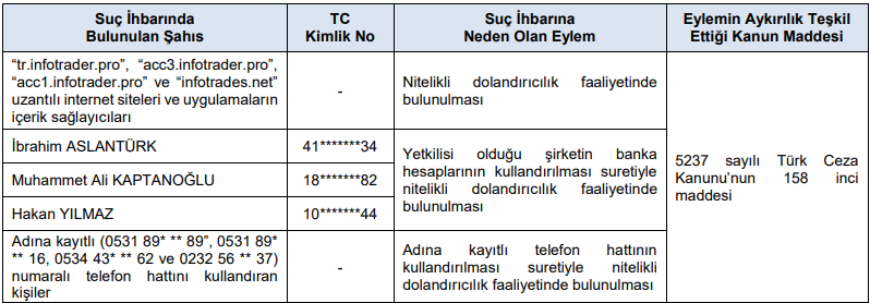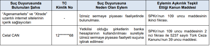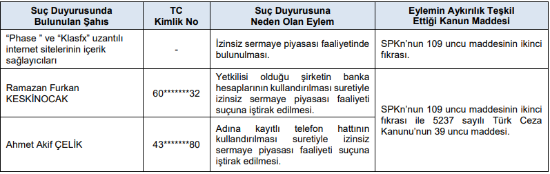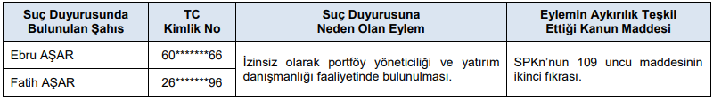 2- C) 6362 sayılı Sermaye Piyasası Kanunu (SPKn) ve ilgili mevzuat kapsamında yapılan incelemeler sonucunda, aşağıdaki tabloda belirtilen suç duyurularının yapılmasına karar verilmiştir.