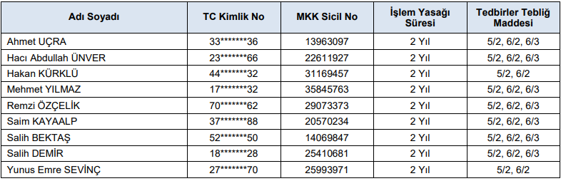 Kimlik bilgileri aşağıdaki tabloda yer alan şahıslar hakkında, 6362 sayılı SPKn’nun 101/1-(a) maddesi ve Kurulumuzun V-101.1 Bilgi Suistimali ve Piyasa Dolandırıcılığı İncelemelerinde Uygulanacak Tedbirler Tebliği’nin 5/2 ve 6/2 maddeleri uyarınca, geçici olarak 2 yıl süreliğine borsalarda işlem yapma yasağı getirilmesine, Kurulumuzun 24.10.2022 tarihli kararı ile haklarında 6 ay süreyle geçici işlem yapma yasağı getirilen Ahmet UÇRA, Hacı Abdullah ÜNVER, Mehmet YILMAZ, Remzi ÖZÇELİK, Saim KAYAALP, Salih BEKTAŞ ve Salih DEMİR adlı şahıslar hakkında, V-101.1 Bilgi Suistimali ve Piyasa Dolandırıcılığı İncelemelerinde Uygulanacak Tedbirler Tebliği’nin 6/3 maddesi uyarınca işlem yasaklı kaldıkları sürenin 2 yıllık süreden düşülerek uygulanmasına karar verilmiştir.