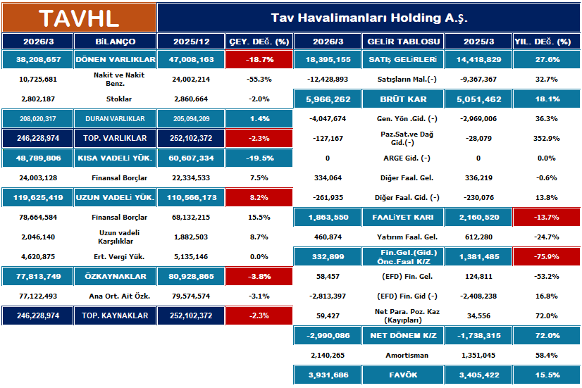 TAVHL’nin satış gelirleri ve FAVÖK seviyesi büyümeye devam etse de, nakit pozisyonundaki ciddi azalma ve artan net zarar dikkat çekici. Özellikle 1,00’in altındaki cari oran ve %68’lik kaldıraç oranı, şirketin borç yönetimi ve likidite konusunda dikkatli olması gerektiğini işaret ediyor. Mevsimsel etkiler veya büyük çaplı yatırımlar bu tabloyu etkilemiş olabilir.
