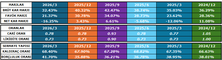 - Brüt Kar Marjı: %38,74’ten (2025/3) %32,43’e (2025/12) gerilemiş. Maliyet artışları karlılığı bir miktar törpülemiş.