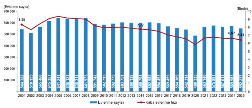 2024 yılında 569 bin 983 olan evlenen çift sayısı, 2025’te 552 bin 237’ye düştü. Bin nüfus başına düşen evlenme sayısını ifade eden kaba evlenme hızı ise 2025’te binde 6,43 olarak kaydedildi.