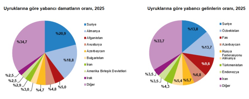 Yabancı damatlar arasında Suriyeliler yüzde 20,9 ile ilk sırada yer aldı. Suriyelileri yüzde 18,8 ile Alman ve yüzde 5,0 ile Afgan damatlar izledi.