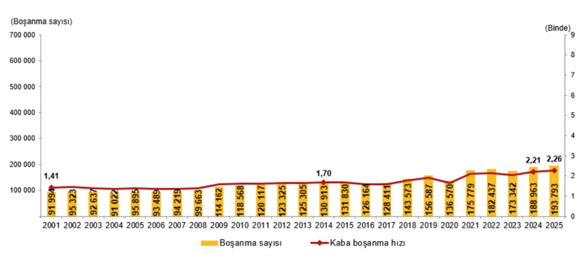 Boşanan çift sayısı 2024’te 188 bin 963 iken 2025’te 193 bin 793’e yükseldi. Kaba boşanma hızı 2025 yılında binde 2,26 olarak gerçekleşti.