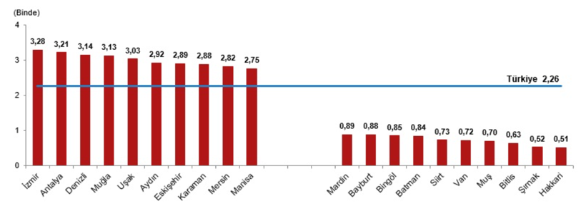 Kaba boşanma hızının en yüksek olduğu il binde 3,28 ile İzmir oldu. İzmir’i binde 3,21 ile Antalya ve binde 3,14 ile Denizli izledi. En düşük boşanma hızına sahip il ise binde 0,51 ile Hakkari oldu. Şırnak (binde 0,52) ve Bitlis (binde 0,63) diğer düşük oranlı iller arasında yer aldı.