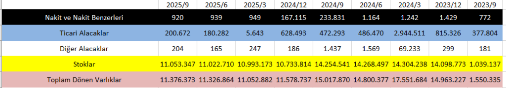 Bu düşüş tek başına alarm sebebi. Şirketin kasası neredeyse boşalmış. 2025 yılına giriş ile “Nakit ve Benzerleri” neredeyse boşalmış. Stoklar erimiyor, nakit yaratamıyor.