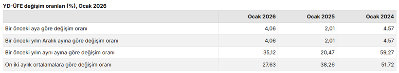 Türkiye İstatistik Kurumu tarafından açıklanan 2026 yılı Ocak ayı Yurt Dışı Üretici Fiyat Endeksi (YD-ÜFE) verilerine göre, endeks yıllık bazda yüzde 35,12, aylık bazda ise yüzde 4,06 artış kaydetti.