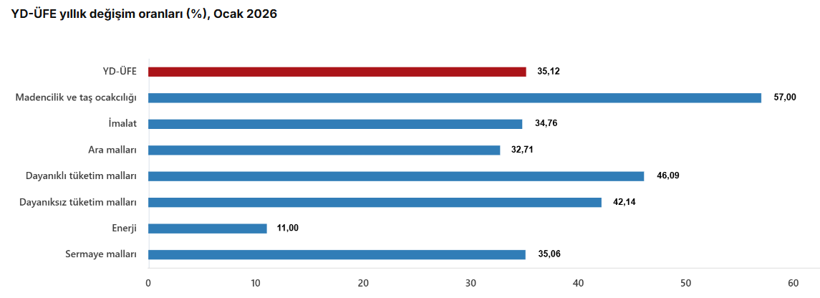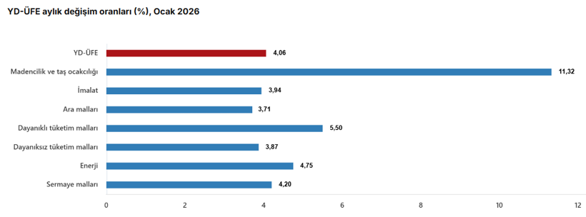 Ana sanayi gruplarında ise yıllık bazda en dikkat çekici artış dayanıklı tüketim mallarında görüldü. Bu grupta fiyatlar yüzde 46,09 yükselirken, dayanıksız tüketim mallarında yüzde 42,14, sermaye mallarında yüzde 35,06, ara mallarında yüzde 32,71 artış kaydedildi. Enerji grubundaki yıllık artış ise yüzde 11,00 ile diğer gruplara kıyasla daha sınırlı kaldı.
